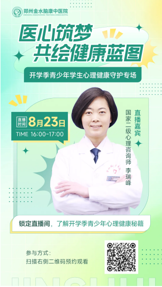 8月23日,鄭州金水腦康中醫(yī)院特開展“醫(yī)心筑夢,共繪健康藍圖——開學季青少年學生心理健康守護專場”直播活動,帶孩子們新學期有效開局,滿血復活!