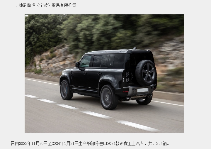 據(jù)國(guó)家市場(chǎng)監(jiān)督管理總局缺陷產(chǎn)品召回技術(shù)中心消息,日前,捷豹路虎(中國(guó))投資有限公司、捷豹路虎(寧波)貿(mào)易有限公司根據(jù)《缺陷汽車產(chǎn)品召回管理?xiàng)l例》和《缺陷汽車產(chǎn)品召回管理?xiàng)l例實(shí)施辦法》的要求,向國(guó)家市場(chǎng)監(jiān)督管理總局備案了召回計(jì)劃,自2024年6月26日起,捷豹路虎(中國(guó))投資有限公司召回2023年11月28日至2023年12月21日生產(chǎn)的部分進(jìn)口2024款捷豹F-PACE,路虎發(fā)現(xiàn)、攬勝運(yùn)動(dòng)、攬勝、攬勝星脈汽車,共計(jì)915輛。捷豹路虎(寧波)貿(mào)易有限公司召回2023年11月30日至2024年1月31日生產(chǎn)的部分進(jìn)口2024款路虎衛(wèi)士汽車,共計(jì)854輛。