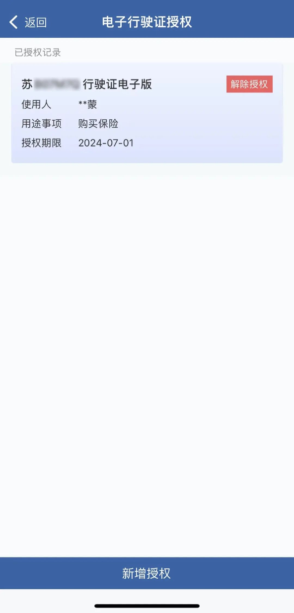 授權(quán)有效期最長為7個工作日。機(jī)動車所有人或單位法人、車輛管理人員可在授權(quán)列表中點擊【解除授權(quán)】按鈕中途解除授權(quán),解除授權(quán)或授權(quán)到期后電子行駛證自動作廢,被授權(quán)人“交管12123”APP不再顯示。