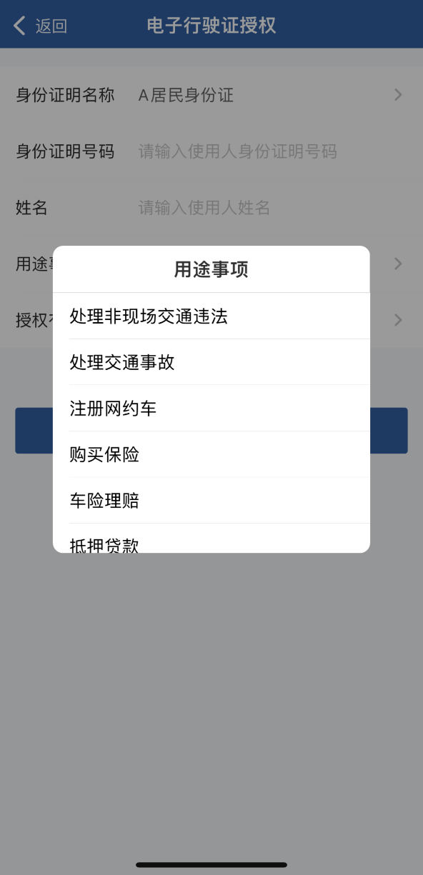 點擊電子行駛證下方【授權(quán)】按鈕進(jìn)入授權(quán)列表,點擊頁面下方【新增授權(quán)】,填寫被授權(quán)人身份證號、姓名和授權(quán)有效期,選擇用途事項,提交授權(quán)。提交后被授權(quán)人電子證件列表中將增加授權(quán)電子行駛證列表項,用戶可點擊顯示授權(quán)出示的電子行駛證。